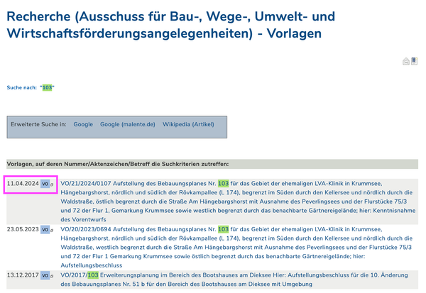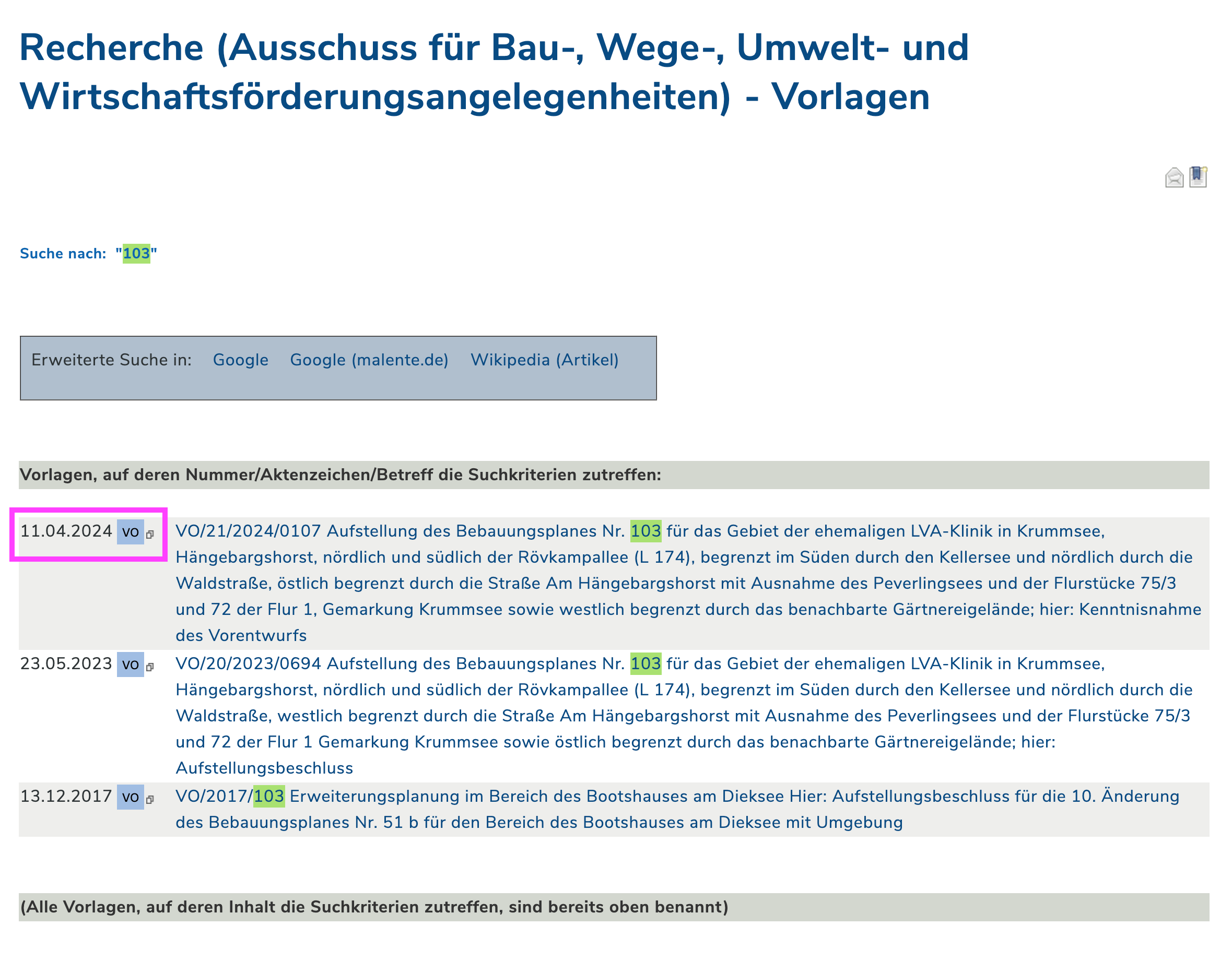 Der Tagesordnungspunkt Ö3 Aufstellung des Bebauungsplanes Nr. 103 für das Gebiet der ehemaligen LVA-Klinik in Krummsee, Hängebargshorst […] bietet 2 Einstiegspunkte: